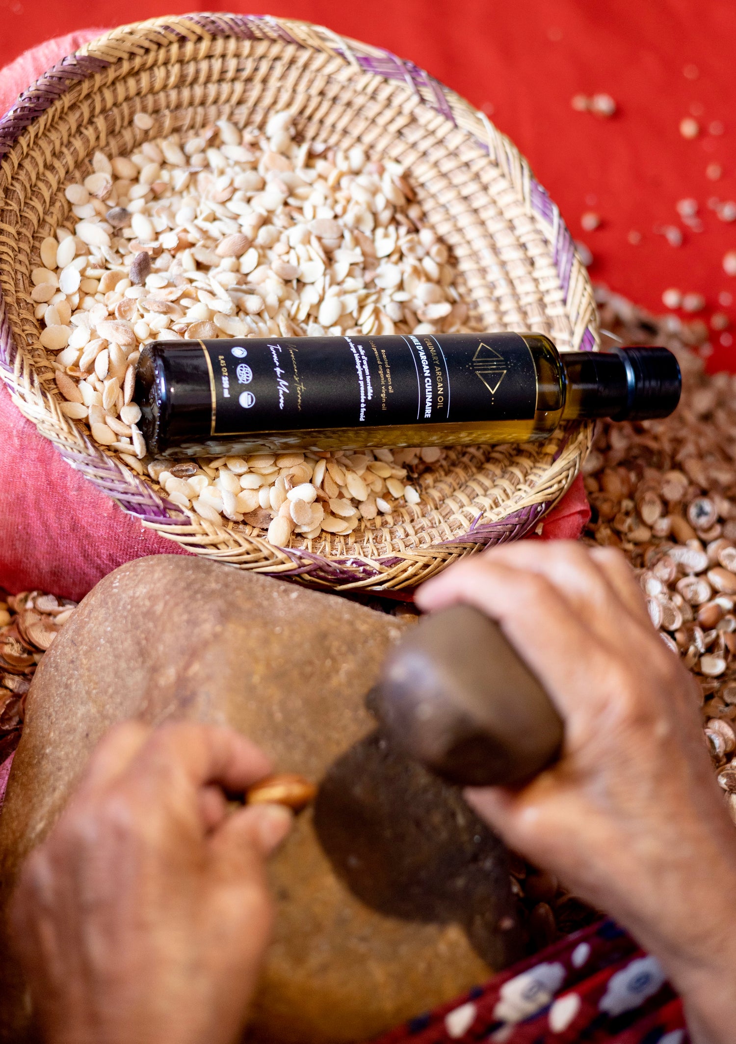 It all starts between June and August, as Amazigh women handpick ripe argan fruits. These are dried and carefully stored before depulping, where the fruits are cracked open to reveal the kernels.